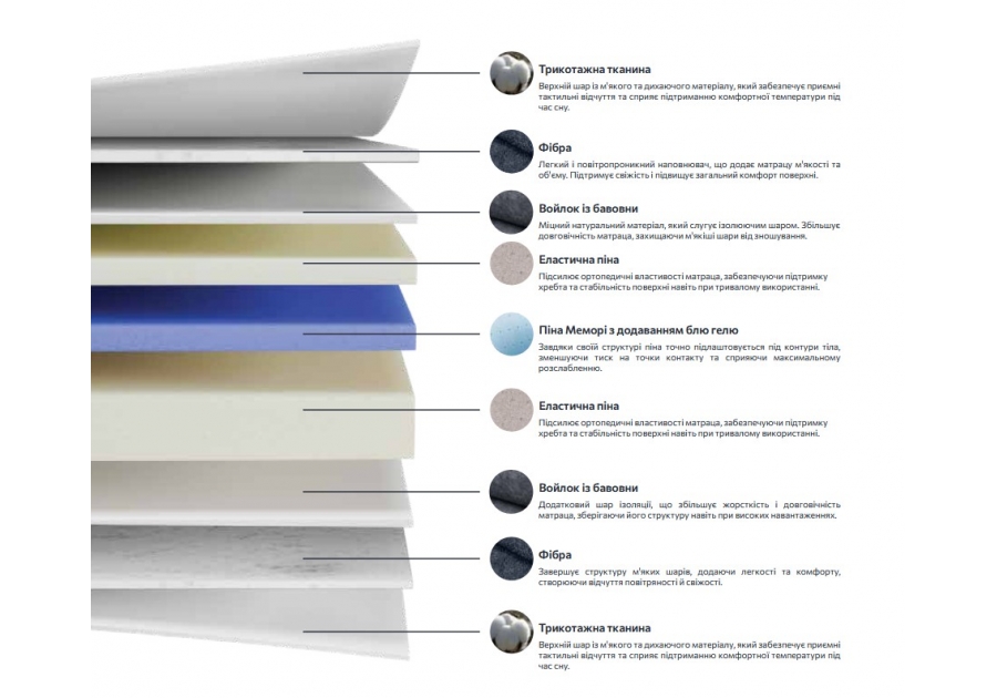 Пена Memory Blue Gel - уникальный материал с капсулами геля в структуре, которые обладают высокой теплопроводностью и удельной теплоемкостью. Это идеальный баланс свойств Technogel и Memory. Мемори Блу Гель великолепно повторит контуры вашего тела, и распределит давление. Независимо от времени года и температуры в помещении матрас обеспечит оптимальную терморегуляцию: в жаркое время он будет дольше оставаться прохладным, а если вы встанете из постели в холодном помещении, сохранит температуру тела. Безопасность Memory Gel подтверждена европейским сертификатом CertiPUR.