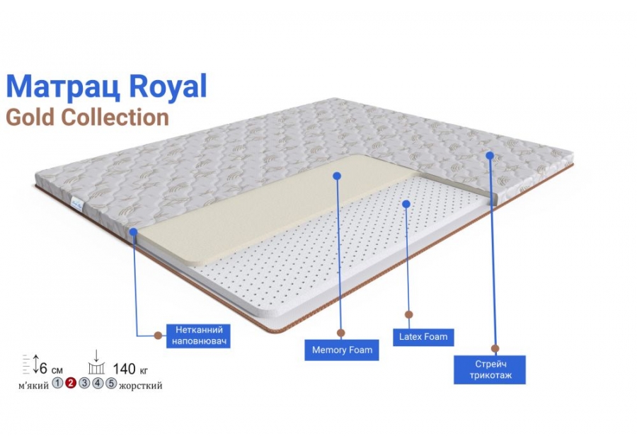 Royal GOLD Family Sleep – тонкий двосторонній ортопедичний матрац низької жорсткості. Основою топпера є два види піни – Latex Foam та Memory. Піна Memory – це пружний м'який наповнювач із ефектом пам'яті. Вона адаптується до форми та температури тіла. Піна Memory має підвищені анатомічні характеристики, що дозволяє футон делікатно підтримувати тіло і не пережимать кровоносні судини. Високоеластична піна Latex Foam - є гіпоалергенним матеріалом з еластичною структурою та високою зносостійкістю. Вона добре вентилюється та екологічно безпечна. Піна Latex Foam забезпечує максимальну підтримку хребту, що сприяє повному розслабленню м'язів та покращує кровообіг.